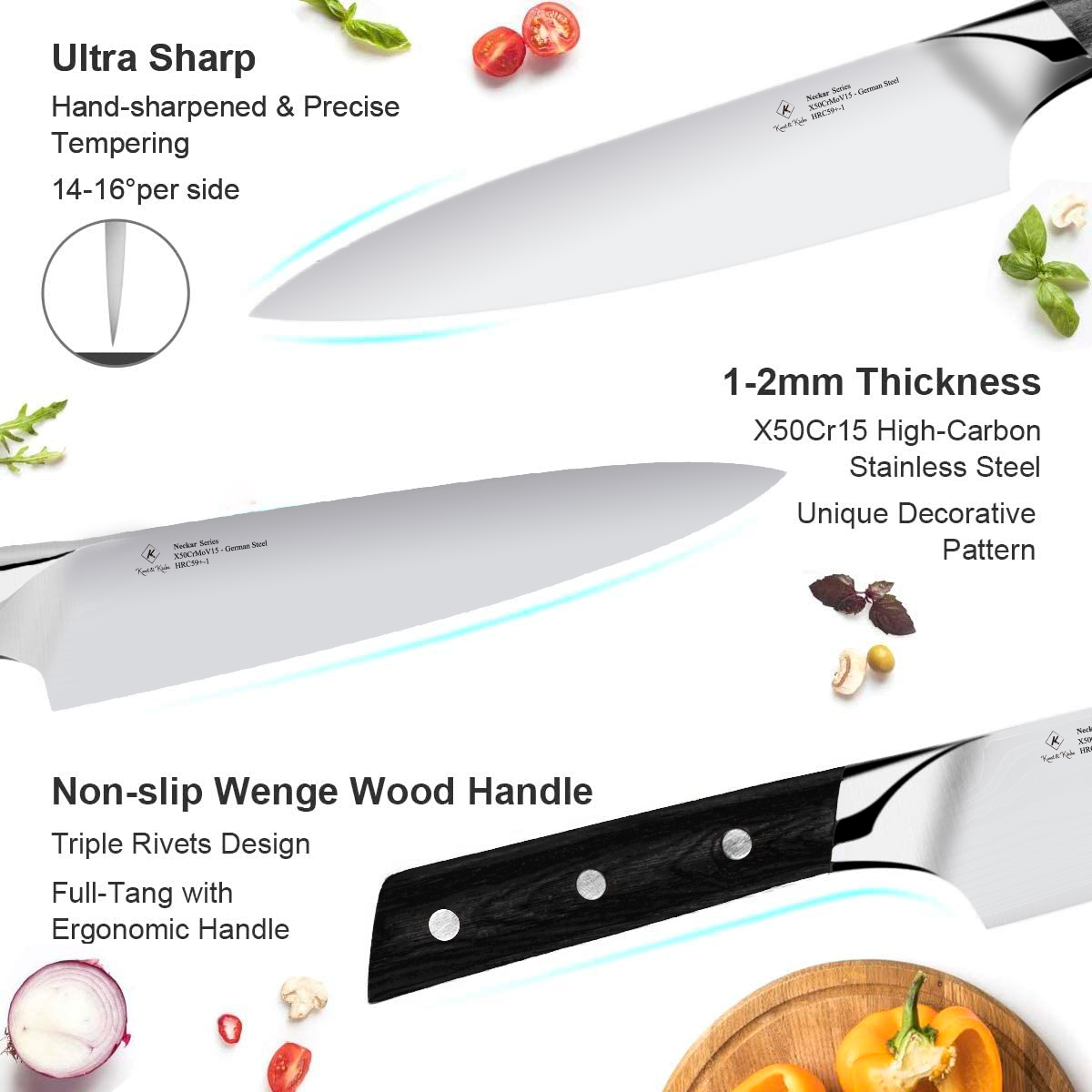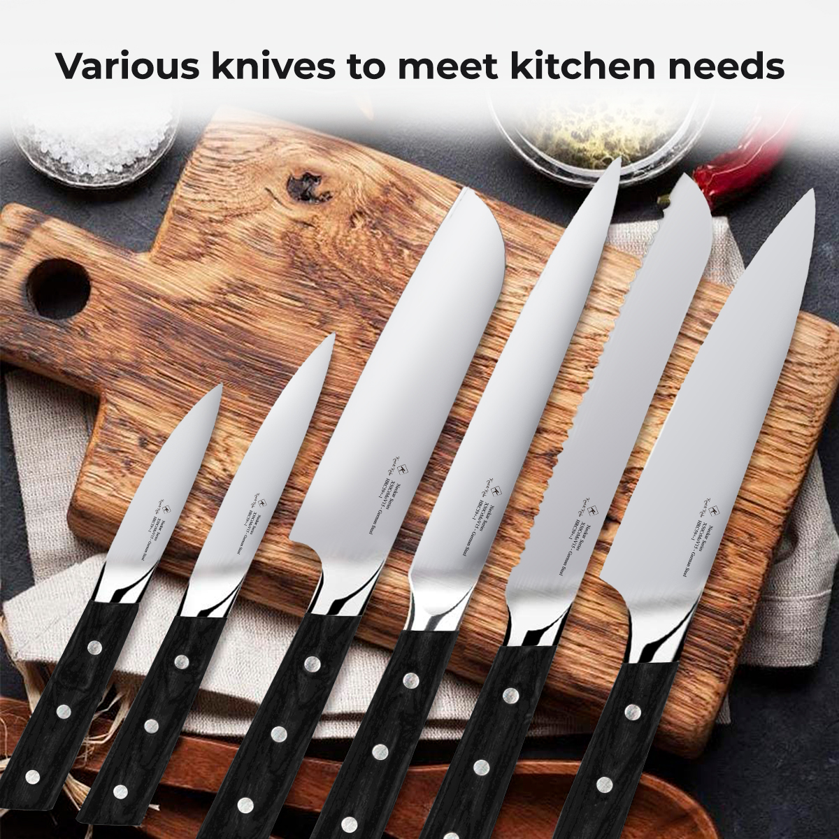 - All these knives are suitable for all kinds of needs on your kitchen - Chef knife, Bread knife, Santoku knife, Slicing Knife, Serrated utility knife, Utility knife, Paring knife, Peeling knife, Boning knife, (6)Steak knives, kitchen shear, knife sharpener and a wood storage block.