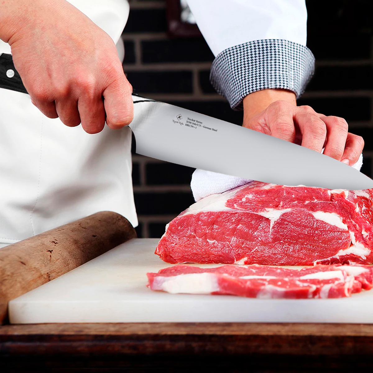 - The ergonomic handle provides a solid grip while the shape of the bolster delivers optimal weight and balance.